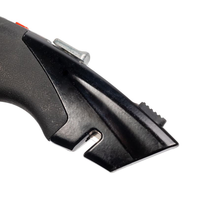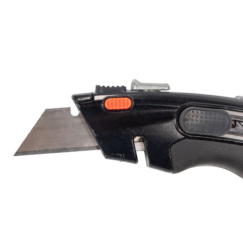 • Предназначен для резки тонких строительных материалов (бумага, картон, пластик, резина и т.д.) • Выдвижное двустороннее трапециевидное лезвие с функциями фиксации и автовозврата • В конструкции ножа предусмотрен стропорез • Ширина лезвия: 19мм • Материал лезвий: инструментальная сталь • Механизм быстрой смены лезвий • В рукоятке ножа находится отсек для хранения лезвий • 4 лезвия в комплекте (1+3 в отсеке хранения) • Эргономичный корпус из легкого сплава с нескользящими вставками • Прорезиненный упор для большого пальца • Корпус оснащен отверстием для подвешивания • Вес: 210г • Длина: 180мм