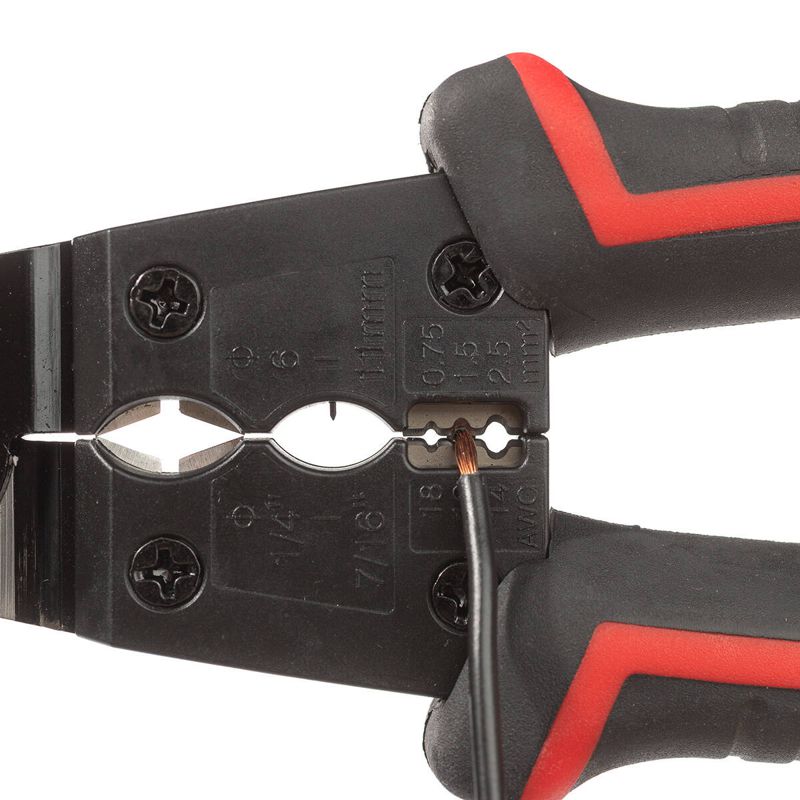 • 4 в 1: • резка проводов ? до 10 мм • снятие жильной изоляции с проводов сечением от 0.5 до 2.5 мм2 • поперечная разделка оболочки круглых кабелей ? от 6 до 14 мм • продольная разделка оболочки круглых кабелей ? от 6 до 11 мм • Трехпозиционные прецизионно заточенные лезвия для зачистки проводов: • гнездо «0.75» для проводов сечением 0.5–0.75 мм2 • гнездо «1.5» для проводов сечением 1–1.5 мм2 • гнездо «2.5» для проводов сечением 2.5 мм2 • Двухкомпонентные нескользящие рукоятки • Скоба для блокировки рукояток • Возвратная пружина • Вес инструмента: 200 г • Длина инструмента: 185 мм