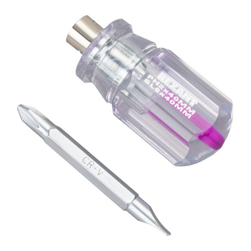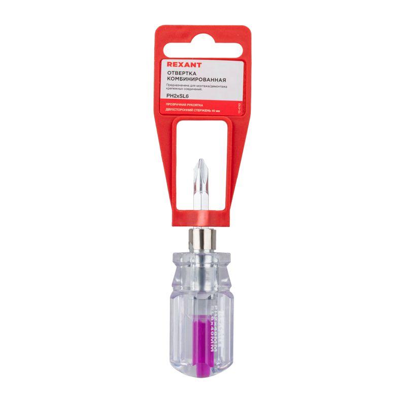 Комбинированная отвертка арт.12-4743 REXANT предназначена для монтажа/демонтажа крепежных соединений. Двухсторонний стержень инструмента выполнен из высококачественной хромованадиевой стали. С одной его стороны располагается шлиц PH2, с другой – SL6. Наконечники намагничены, благодаря чему шуруп, саморез или винт не упадет при извлечении или установке. Прозрачная эргономичная рукоятка делает работу с инструментом легкой и удобной. Длина двухстороннего стержня 40 мм. Шлицы: PH2, SL6