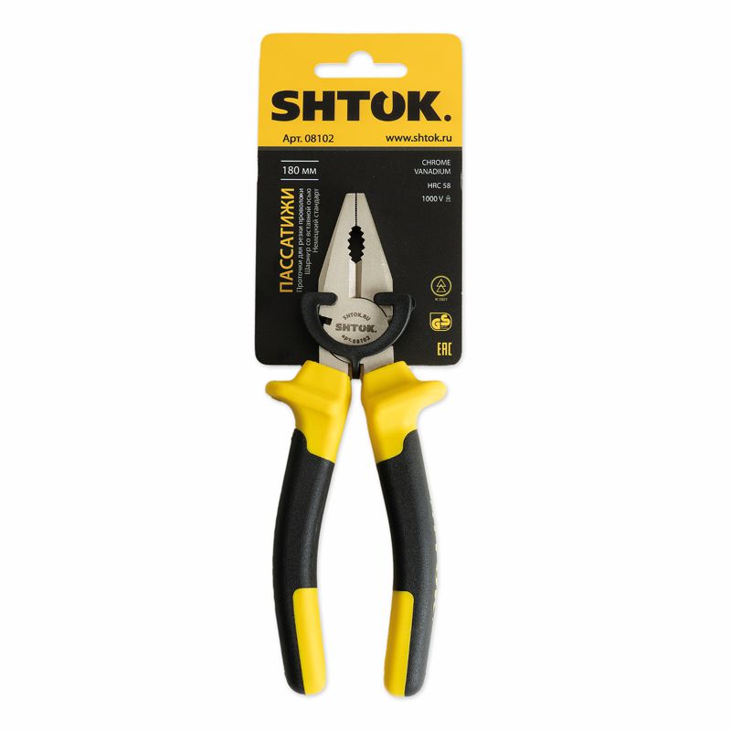 Диэлектрические пассатижи SHTOK 1000В 180 мм 08102 используются для выполнения работ под напряжением. Удобные рукоятки с упорами обеспечивают надежность захвата и удержания инструмента. Прочная рабочая часть инструмента выполнена из хром-ванадиевой стали. Особенности пассатижей SHTOK 08102 Надежность Удобные ручки, выполненные из двухкомпонентного PP/TPR пластика и оснащенные специальными упорами, обеспечивают надежный захват и удержание инструмента во время работы.