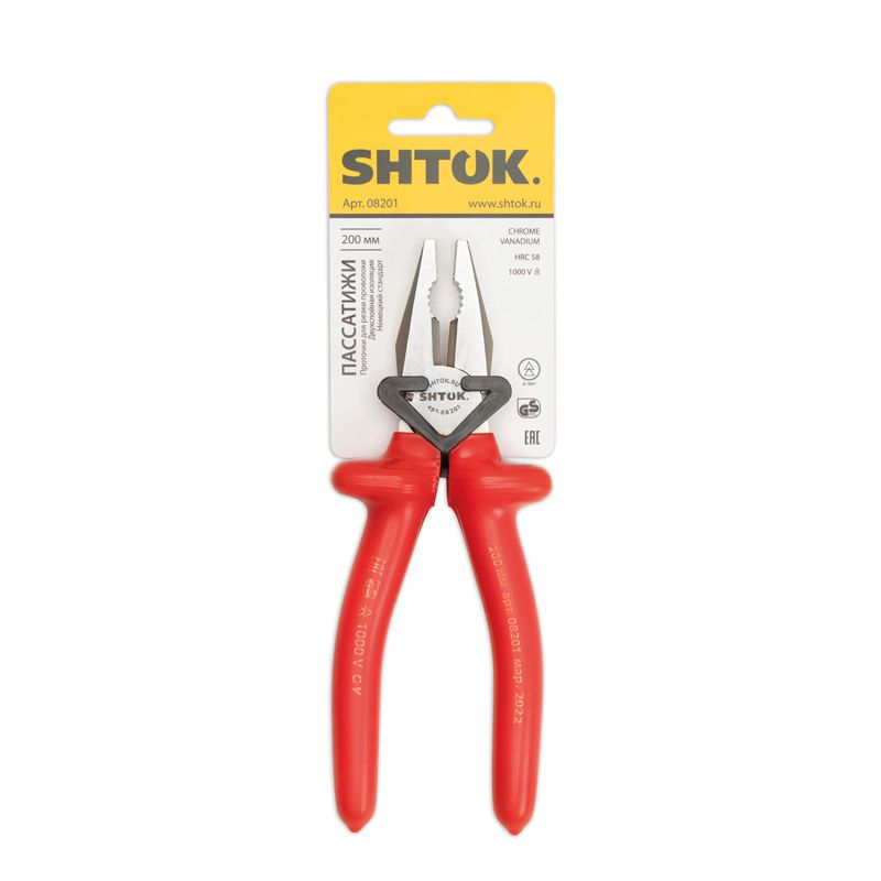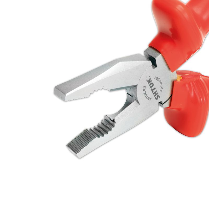 Диэлектрические пассатижи SHTOK 1000В 200 мм 08201 оснащены рабочей частью из хром-ванадиевой стали. Рукоятки инструмента выполнены со специальными упорами. Пассатижи предназначены для работ под напряжением пока не поврежден верхний красный слой рукояток. Особенности пассатижей SHTOK 08201 Прочность Рабочая часть диэлектрических пассатижей SHTOK 1000В 180 мм 08202, выполненная из хром-ванадиевой стали, увеличивает прочность инструмента. Удобство эксплуатации Рукоятки выполнены из двухслойного пластизоля методом погружения. При повреждении верхнего красного слоя становится виден внутренний желтый цвет, что сигнализирует о невозможности дальнейшего использования инструмента в работах под действующим напряжением