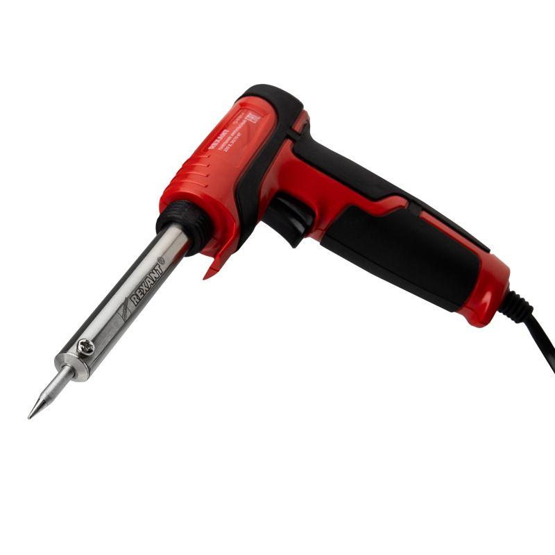 Паяльник-пистолет двухрежимный серии ПРОФИ мощностью 30/70Вт REXANT предназначен для ручного монтажа/демонтажа электронных компонентов и других мелких и средних деталей. Конструктивные особенности: рукоятка в форме пистолета из термостойкого пластика с резиновыми вставками, два режима мощности 30Вт и 70Вт. Наличие 2-х режимов обеспечивает экономичное энергопотребление. Максимальная мощность и ускоренный разогрев активируются нажатием и удержанием кнопки, расположенной на рукоятке. Это позволяет сначала установить жало в определенную точку пайки, а затем перевести паяльник в максимальный рабочий режим. Долговечное жало паяльника состоит из медьсодержащего сердечника, покрытого слоем электролитически осажденного железа, отличающегося высокой стойкостью к коррозии. В случае необходимости его быстро заменить (сменное жало в комплект не входит). На корпусе расположен индикатор включения. Длина провода: 1,35 м.