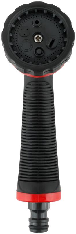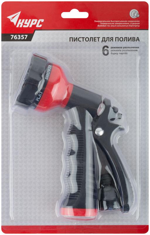 6 режимов распыления. Скоба-фиксатор для непрерывной подачи воды. Универсальное быстросъемное соединение. Материал: пластиковый корпус, обрезиненная ручка. Упаковка: блистер.