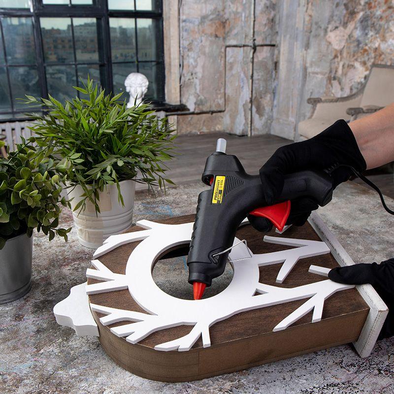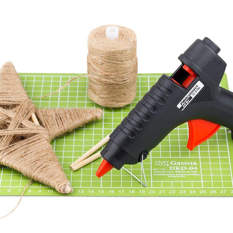 Клеевой пистолет предназначен склеивания поверхностей различных материалов, герметизации стыков и швов, фиксации проводов с помощью расплавленной клеевой массы. Используется в ремонте, декорировании, в изготовлении поделок и моделировании; будет полезен как на производстве, так и в быту. Корпус пистолета изготовлен из ударопрочной пластмассы, поэтому инструмент служит дольше, а металлическая скоба позволяет устанавливать пистолет в режиме ожидания. Сопло пистолета защищено клапаном от произвольного вытекания клея и оснащено термостойким силиконовым протектором, минимизирующим риск ожогов при случайном контакте и защищающим рабочую зону от высокой температуры. Пистолет используется с клеевыми стрежнями диаметром 11 мм. Комплектация: клеевой пистолет (1 шт.), паспорт (1 шт.). ОСНОВНЫЕ ПРЕИМУЩЕСТВА 1. Быстрый нагрев. 2. Защита от произвольного вытекания клея из плавильной камеры. 3. Стабильная температура при постоянной работе. 4. Термостойкий силиконовый протектор сопла с длительным сроком службы. 5. Возможность управления одной рукой, легкий контроль плавления и подачи клея.