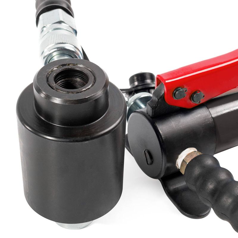 • В комплекте: • гидравлический пресс ППО-60 и помпа ПМР-7003 • рукав высокого давления длиной 1.3 м • набор из 8 сменных перфоформ • 2 резьбовые шпильки М10/20 и М20/20 • опорная втулка и ремкомплект (уплотнительные кольца) • прочный пластиковый кейс • Диаметры перфоформ в комплекте (мм): 16.2/18.6/20.5/22.5/25.4/28.3/37.0/47.0 • Перфоформа представляет пару «матрица – пуансон» • Круглые перфоформы ? до 28.3 мм включительно разрезают кольцевой отход на две части во избежание застревания высечки внутри перфоформы • Толщина пробивки листового металла: сталь St 37 – до 3 мм, нержавеющая сталь – до 1.5 мм • Максимальное усилие: 10 т • Вес комплекта/инструмента: 8.90/5.60 кг • Габариты кейса: 480х350х150 мм • Рекомендованные матрицы: • круглые МПО o 15.2–64.0 мм • квадратные МПО 22х22–50.8х50.8 мм • наборы матриц НМПО-PG, НМПО-MG