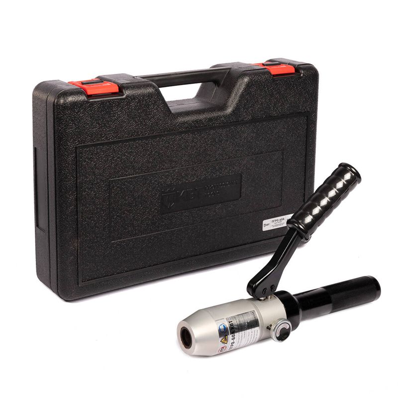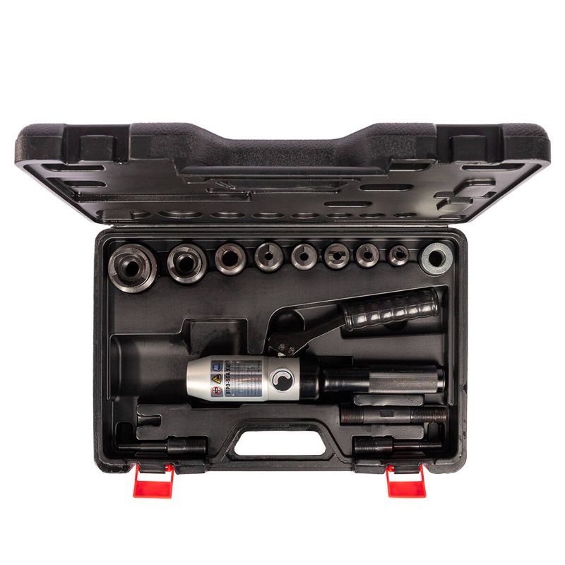 • В комплекте: • гидравлический прямой пресс ПГРО-60А • набор из 8 сменных перфоформ • 2 резьбовые шпильки М10/20 и М20/20 • опорная втулка • ремкомплект (уплотнительные кольца) • прочный пластиковый кейс • Диаметры перфоформ в комплекте (мм): 16.2/18.6/20.5/22.5/25.4/28.3/37.0/47.0 • Перфоформа представляет пару «матрица – пуансон» • Круглые перфоформы МПО (КВТ) o до 28.3 мм включительно имеют специальную конструкцию. Они разрезают кольцевой отход на две части во избежание застревания высечки внутри перфоформы • Толщина пробивки листового металла: сталь St 37 – до 3 мм, нержавеющая сталь – до 1.5 мм • Максимальное усилие: 5 т • Вес комплекта/инструмента: 4.00/1.80 кг • Габариты кейса: 450х300х95 мм • Рекомендованные матрицы: • круглые МПО o 15.2–64.0 мм • квадратные МПО 22х22–50.8х50.8 мм • наборы матриц НМПО-PG, НМПО-MG