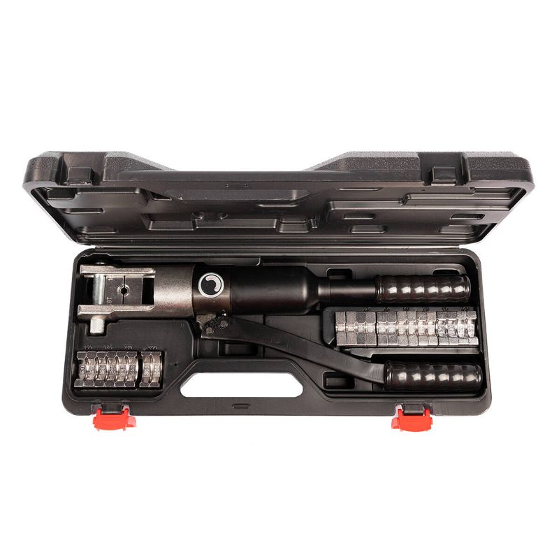 • Предназначены для опрессовки медных и алюминиевых неизолированных трубчатых наконечников • В комплекте: • ручной гидравлический пресс ПГРс-300 • набор из 12 сменных матриц • ремкомплект (уплотнительные кольца) • прочный пластиковый кейс • Диапазон сечений: • кабельные наконечники 10–300 мм2 • Механизм автоматического сброса давления (АСД) • Клапан ручного сброса давления • Двухскоростная помпа • Усиленная рабочая голова • Максимальное усилие: 12 т • Ход поршня: 20 мм • Вес комплекта/инструмента: 6.50/4.00 кг • Длина: 470 мм • Габариты кейса: 490х185х90 мм • Дополнительные аксессуары: наборы матриц НМ-300 ТМ, НМ-300 ТМЛс, НМ-300 ТА, НМ-300 DIN, НМ-300 ПМ, НМ-300 СОАС, НМ-300 НШВИ, НМ-300 С, НМ-300 СИП