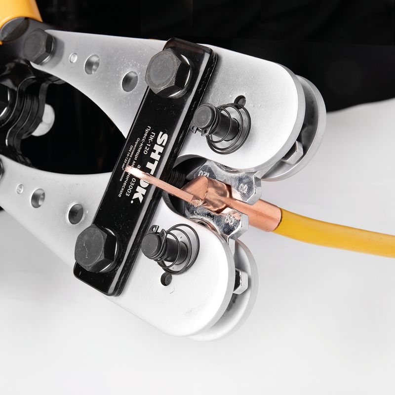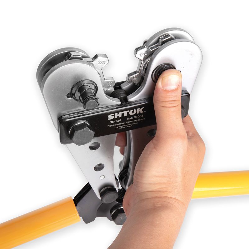Ручные пресс-клещи SHTOK ПК-120 03003 легко перенастраивается под любые сечения наконечники. Имеет небольшие размеры и малый вес для комфортной и удобной работы. Предназначен для выездной и мобильной работы. Конструкция револьверного крепления матриц без люфта, что обеспечивает качественную опрессовку; Опрессовка в одно движение; Быстрая перенастройка на нужный размер; Особенности пресс-клещей SHTOK 03003 Надежность Особая конструкция ручных гидравлических пресс-клещей SHTOK ПК-120 03003 плотно зажимает кабель, не давая ему ""выйти"" из рабочей области. Минимальная площадь опрессовки 16 мм. Комфорт Резиновая рукоятка предотвращает скольжение руки.