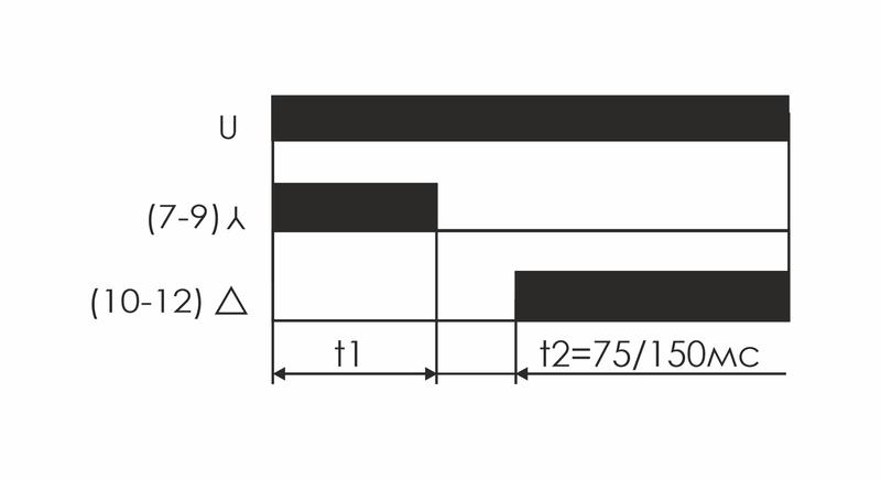 Реле времени серии "PCG" Монтаж на DIN-рейку. Предназначено для управления контакторами, переключающими обмотки электродвигателей со схемы «ЗВЕЗДА» при пуске на схему «ТРЕУГОЛЬНИК» в рабочем режиме. Принцип работы Реле времени имеет 2 релейных выхода. Каждый управляет отдельным контактором. В момент пуска его первый выход включает контактор S? (замыкаются контакты 7-9) и обмотки электродвигателя подключаются по схеме «ЗВЕЗДА», что снижает пусковой ток в несколько раз. По окончании времени выхода двигателя на рабочий режим (время t1) наступает пауза (t2), когда оба контактора выключены, затем включается контактор S? (замыкаются контакты 10-12), включающий обмотки по схеме «ТРЕУГОЛЬНИК». Особенности: напряжение питания 230 В AC; 24 В AC/DC; время пуска 1-1000 с; время переключения 75 / 150 мс; контакт - 2NO/NC (2х8 А).