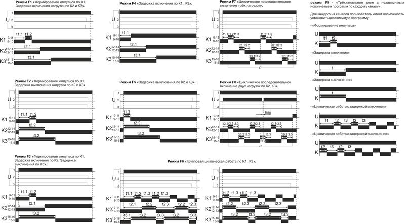 Реле времени серии "RV" Монтаж на DIN-рейку. Предназначенодля коммутации электрических цепей (до 3-х независимых цепей К1, К2, К3) с предварительно установленными выдержками времени t1, t2 и t3 для применения в схемах автоматики. Режимы работы Режим F1.1...F1.3 - «Формирование импульса по К1. Задержка включения нагрузки по К2 и К3»; Режим F2.1...F2.3 - «Формирование импульса по К1. Задержка выключения нагрузки по К2 и К3»; Режим F3.1...F3.3 - «Формирование импульса по К1. Задержка включения по К2. Задержка выключения по К3»; РежимF4.1...F4.3 - «Задержка включения по К1...К3»; Режим F5.1...F5.3 - «Задержка выключения по К1...К3»; Режим F6.1...F6.3 - «Групповая циклическая работа по К1...К3»; Режим F7.1...F7.3 - «Циклическое последовательное включение трёх нагрузок»; Режим F8.1...F8.3 - «Циклическое последовательное включение двух нагрузок по К2, К3»; Режим F9.1...F9.3 - «Трёхканальное реле с независимым исполнением программ по каждому каналу» Особенности: трехканальное; цифровая индикация; 9 режимов работы; по три ячейки памяти для каждого режима; напряжение питания 24 В AC/DC; диапазон выдержки времени 0 с... 99 ч 59 мин ; контакт - 3NO/NC (3х8 А).