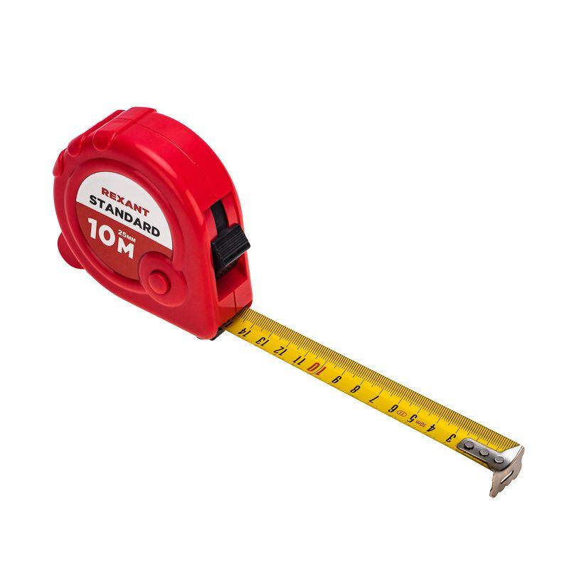 Измерительная рулетка REXANT Стандарт используется при проведении измерительных работ в строительстве, хозяйстве, ландшафтных и геодезических исследованиях. Двухкомпонентный прорезиненный корпус, выполненный из ударопрочного пластика, не скользит в руках. Прочное полотно без изломов имеет глянцевое покрытие. Для удобства использования предусмотрены кнопки стопора и фиксации тормоза. Инструмент оснащен удобным зацепом с отверстием посередине, которое позволяет зафиксировать полотно рулетки на шляпке гвоздя или самореза. На корпусе расположена клипса-зажим для фиксации рулетки на ремне, кармане или поясной сумке. Ремешок позволяет надевать инструмент на запястье, чтобы освободить руки для работы.