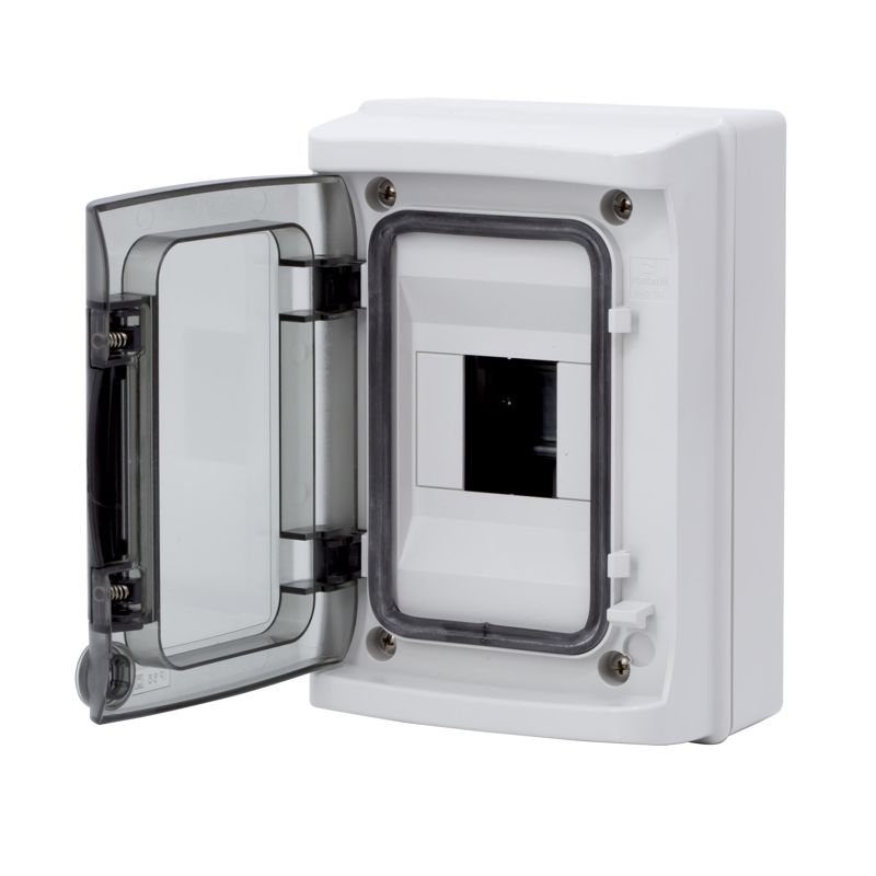 Настенный модульный щиток с прозрачной затемненной дверцей. Предназначен для монтажа в жилых и административных помещениях для установки автоматических выключателей любых производителей: таймеров, устройств защитного отключения и управления освещением и т.д. В комплект поставки входят: ручка на дверце, оцинкованная DIN-рейка, заглушки для пустых модулей, сборочные винты. Степень пыле- и влагозащиты IP 65. Ударопрочность корпуса IK09. Количество модулей - 4. Параметры щитка: ширина - 142 мм, высота - 210 мм, глубина - 100 мм. Материал - термостойкий пластик. Цвет - серый..