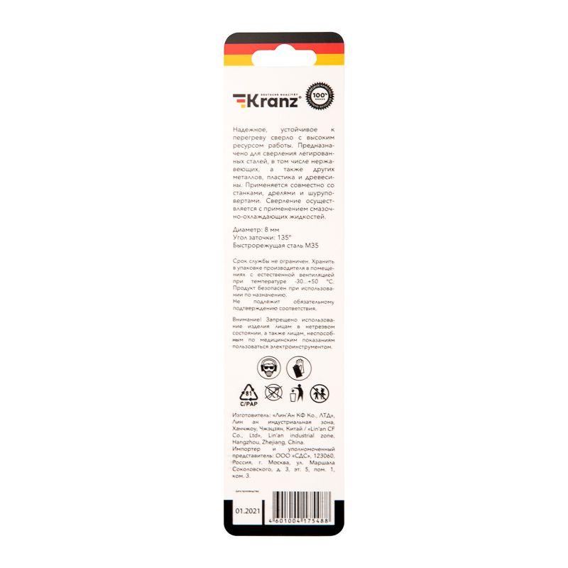 Сверло по металлу 8мм "Кобальт" (сталь HSS-Co 5% M35 P6M5K5) DIN 338 (блист.1шт) Kranz KR-91-0510