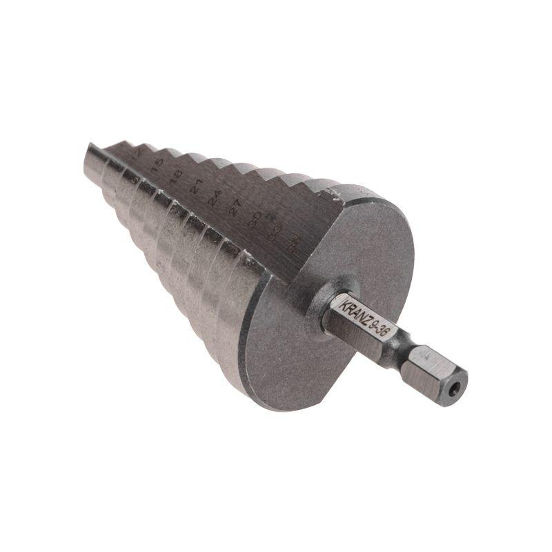 Ступенчатое сверло KRANZ применяется при выполнении монтажно-сборочных работ для сверления отверстий различных диаметров без перестановки режущего инструмента. Применяется в работе с такими материалами, как пластик, дерево, металл и др. Благодаря своей уникальной конструкции изделие заменяет целый набор традиционных спиральных сверл. Использование оснастки позволяет сэкономить время мастера, так как не требует предварительного кернения и сверления. Шестигранный хвостовик Е6,3 обеспечивает надежную фиксацию сверла во всех типах патронов шуруповертов и дрелей. Форма канавки – прямая. На каждой из 10 ступеней сверла нанесена маркировка фактического диаметра. Диапазон ступеней: 9, 12, 15, 18, 21, 24, 27, 30, 33, 36 (шаг 3 мм). Сверло изготовлено из быстрорежущей инструментальной стали (HSS) и обладает высокой прочностью, а также устойчивостью к динамическим нагрузкам и перегреву.