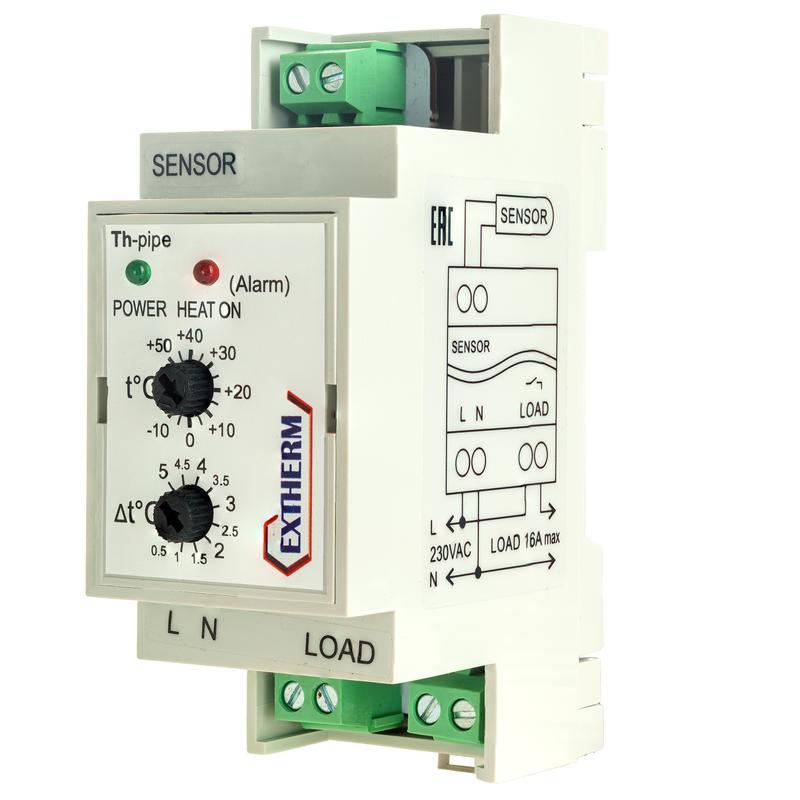 Терморегулятор EXTHERM Th-pipe предназначен для обогрева труб и резервуаров для монтажа на DIN рейку. Преимущества: • Независимое реле «сухой контакт» NO • Индикация рабочего состояния • Индикация нагрева • Индикация обрыва датчика • Механическая настройка Применение: • Поддержание температуры в диапазоне • Трубопроводы • Резервуары