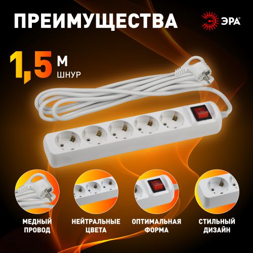 Удлинитель электрический Эра UX-5es-1,5m с заземлением, с выключателем, ПВС, 3x0,75мм2, 5 розетки, 1,5 м. Рассчитан на максимальную мощность 10А/2200 Вт. Удлинитель Эра станет Вашим надежным помощником, если Ваши любимые электроприборы находятся далеко от розеток. Провод в удлинителях Эра сделан из 100% меди, что делает его абсолютно пожаробезопасным. Корпус выполнен из ударопрочного и негорючего пластика (полипропилен). Вилка обеспечена кольцом для удобного извлечения ее из розетки. Модель удлинителя на 10А позволяет подключить бытовые приборы общей нагрузкой до 2200Вт. Дизайн удлинителя разработан в России командой Эра Style.