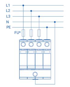 Четырехполюсное УЗИП класса I+II комбинированного типа. УЗИП выполнено из трех варисторных модулей, и одного модуля с разрядником и базы для подключения к сети и креплению на DIN-рейку 35 мм. УЗИП предназначено для защиты оборудования в низковольтных цепях до 1000 В от прямых и отдаленных молниевых разрядов при воздушном или кабельном вводах электропитания. УЗИП выдерживает токовые нагрузки, соответствующие УЗИП класса I, а по способности ограничения импульсных напряжений, допустимых для изоляции оборудования, соответствует УЗИП класса II. Устанавливается в пределах 0А(В) – 1 зон молниезащиты (в соответствии с ГОСТ Р МЭК 62305-1 и СО-153-34.21.122). Применяется для сетей с системами заземления: TN-S, TT. Рекомендуемый номинал предохранителя 125-200 А gL/gG