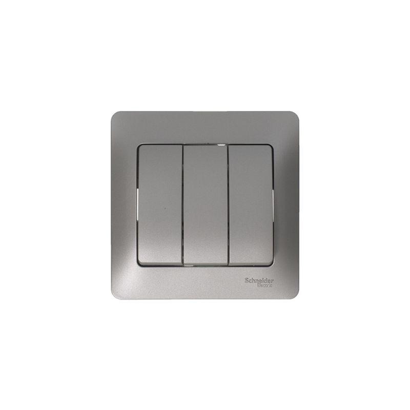 Механизм Systeme Electric (ранее Schneider Electric) серии Glossa (цвет платина) выключателя 3-клавишного подходит для сетей 250 В, на ток 10 А. Трёхклавишный выключатель позволяет управлять тремя источниками света из одной точки. Выполнен из материала PС+ASA, стойкого к УФ-излучению и появлению царапин. Эргономичные клеммы расположены в два ряда: сверху и снизу.