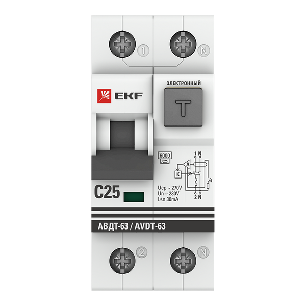 ОБНОВЛЕНИЕ ЛИНЕЙКИ PROXIMA Артикул аналог: D63N26EA25C30 Автоматический выключатель дифференциального тока АВДТ-63 EKF PROxima представляет аппарат, сочетающий функции автоматического выключателя с электромеханическим или электронным УЗО. При обнаружении автоматическим выключателем в защищаемом участке сети тока утечки (повреждения) на землю или сверхтока (тока перегрузки или короткого замыкания) происходит срабатывание устройства, приводящее к отключению защищаемой сети. Возможна коммутация алюминиевым и медным проводником. Автоматический выключатель дифференциального тока малогабаритный АВДТ-63М EKF PROxima представляет аппарат, сочетающий функции автоматического выключателя с электронным УЗО типа АС в компактном корпусе шириной один модуль. При обнаружении автоматическим выключателем на защищаемом участке сети тока утечки (повреждения) на землю или сверхтока (тока перегрузки или короткого замыкания) происходит срабатывание устройства, приводящее к отключению защищаемой сети. Особое отличие дифференциальных автоматических выключателей EKF с электронным УЗО – в наличии блока защиты от перенапряжения. Возможна коммутация алюминиевым и медным проводом.
