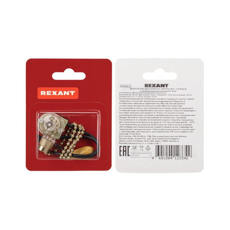 Выключатель для настенного светильника с проводом и деревянным наконечником gold блист. Rexant 06-0243-A