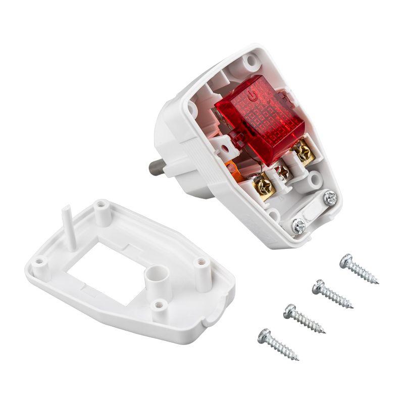 Угловая вилка Евро предназначена для ремонта электрошнура и замены вышедшей из строя неразборной вилки. Используется для подключения различных бытовых приборов к электросети. Походит для проводников сечением от 0,5 до 2,5 мм2. Благодаря угловой конструкции вилка экономит пространство и позволяет удобнее подключаться к розеткам без нагрузки на провод. На корпусе вилки есть кнопка, которая позволяет отключить питание, не вынимая вилку из розетки. Вилка оснащена заземляющий контактом, который снижает риск поражения электрическим током при возникновении замыкания. Корпус изготовлен из пластика, отличается прочностью и надежностью. Вилка предназначена для использования только внутри помещения.